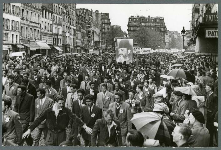 Des milliers de travailleurs algériens, ces « forçats de la faim » comme disait le poète Malek Haddad, défilaient ce 14 juillet aux côtés de leurs camarades de travail français. Un jeune médecin français témoigne: « Les manifestants (algériens) sont bien organisés, encadrés par un service d’ordre avec brassard vert du MTLD (Mouvement nationaliste dont le chef, Messali Hadj, vient d’être incarcéré). Ils scandent divers mots d’ordre et notamment la libération de Messali, ce que réclament notamment leurs pancartes, en même temps que la fin de la répression colonialiste et l’indépendance de l’Algérie… »