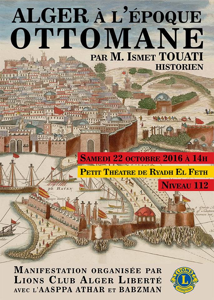 ottomanL’Association Lions Club Alger Liberté, dans le cadre de ses activités culturelles, organise avec l’AASPPA Athar (Association algérienne de sauvegarde et protection du patrimoine archéologique) et le magazine BABZMAN, le 22 octobre 2016, à 14 heures, au  Petit Théâtre de Ryadh El Feth, Niv 112, une conférence consacrée à ALGER au début de la période ottomane.