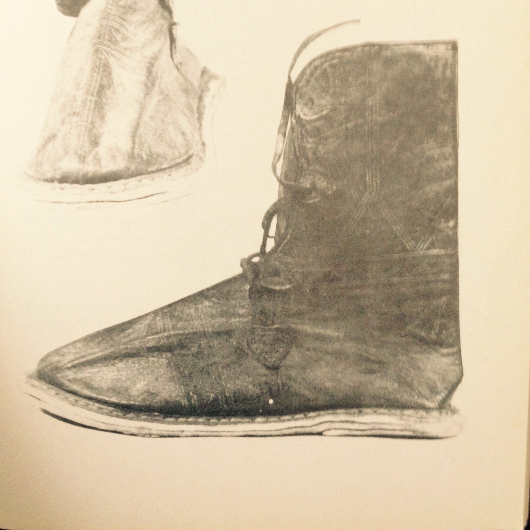 Si la semelle est taillée sur une peau de vache tannée, la botte, elle, est taillée sur de la peau de mouton, comportant un motif à la pointe du pied : Un croissant dont les cornes sont dirigés vers la pointe du pied. Sa longueur est moyennement, selon le pied, longue de vingt-sept centimètres, large de onze et haute de vingt-deux centimètres.