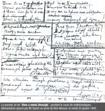 Le poète d’expression amazighe a écrit : « Debout fils d’Amazigh ! / Notre soleil s’est levé, / Il y a longtemps que je ne l’avais vu, / Frère, notre tour est arrivé. » Cette première strophe du texte poétique de Mohamed Idir Aït Amrane est déjà un appel à l’insoumission, à l’action contre l’occupation coloniale française. Il a alors près de 21 ans quand il a écrit et composé ces vers de Ekkr a mm is umazigh, le mardi 23 janvier 1945. Sadek Hadjeress, son ami et compagnon au combat national, témoigne : « Je me souviens alors comment, à la pause d’après midi d’une grise journée hivernale de début 1945, dans un préau du lycée balayé par un vent glacial, il nous chanta le refrain et l’ébauche des premiers couplets de ce qui allait devenir l’hymne Debout fils d’Amazigh. Il venait de le composer, après une longue maturation, en griffonnant le texte (qu’il a conservé avec toutes ses ratures) pendant un cours de maths ».