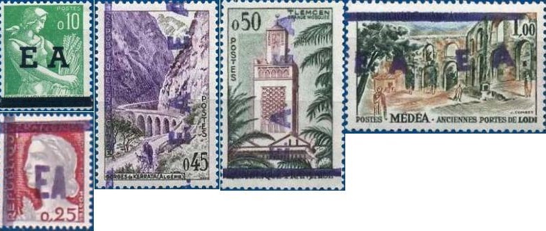 Quelques jours avant la proclamation de l’indépendance, la nouvelle autorité administrative devant assurer la continuité du service postal prend la décision (Décision du 27 Juin 1962) de surcharger certains timbres français d’usage courant en y apposant les deux lettres « E.A » (Etat Algérien) après avoir rayé la mention « République Française ».